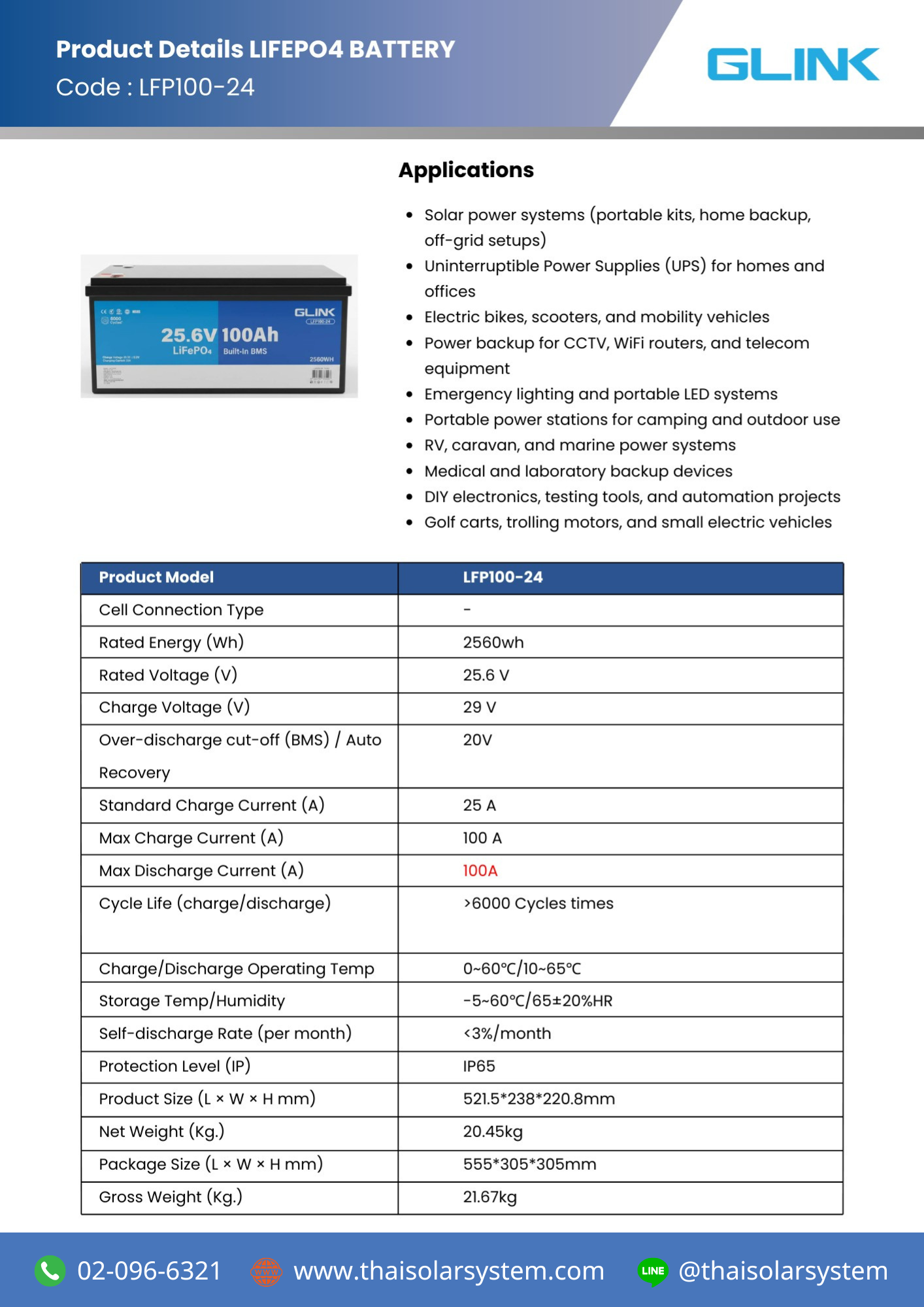 BATTERY LIFEPO4 GLINK 100Ah 25.6V (ประกัน 3 ปี)