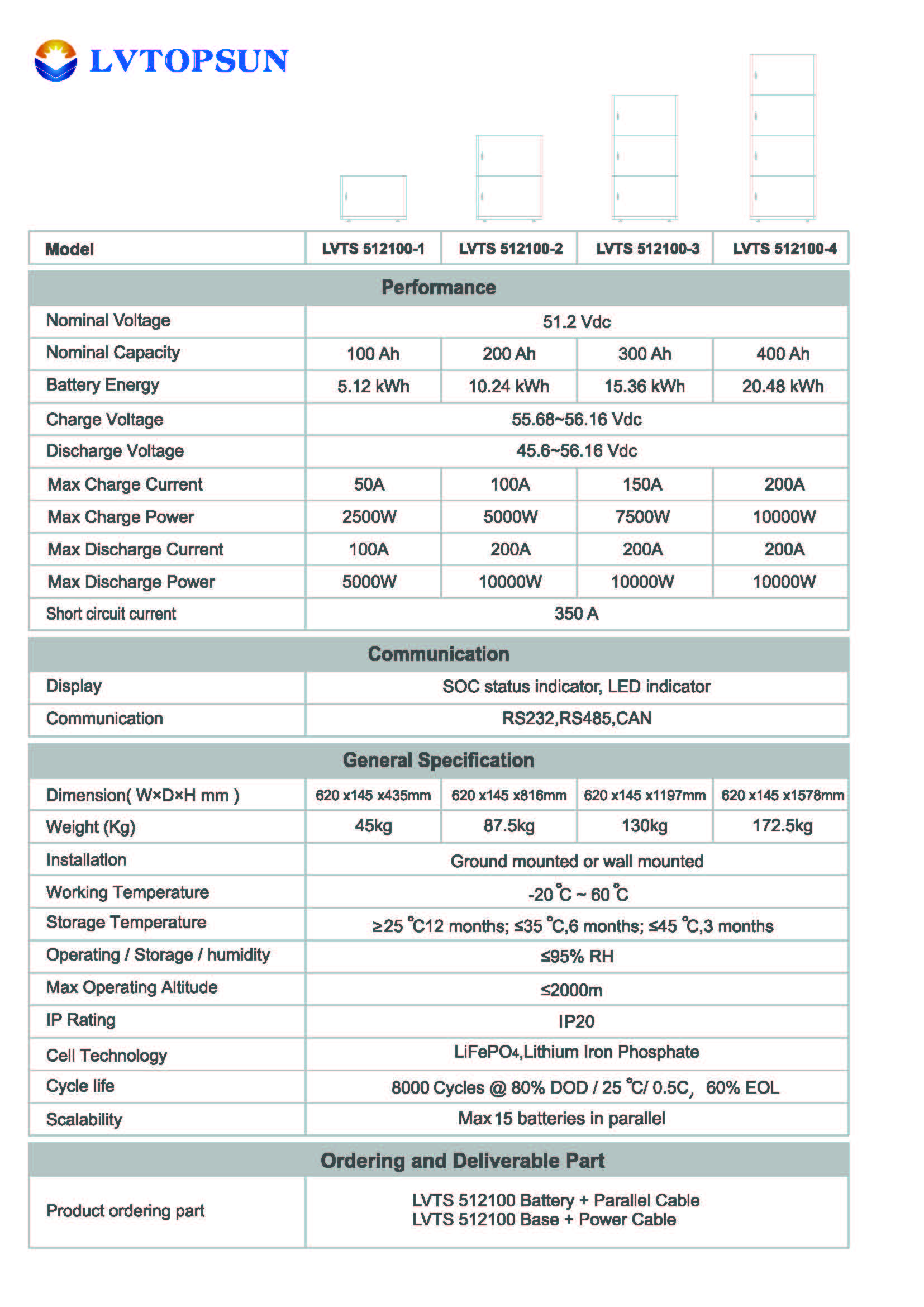 BATTERY LiFePO4 LVTOPSUN 100Ah 51.2V (ประกัน 10 ปี)